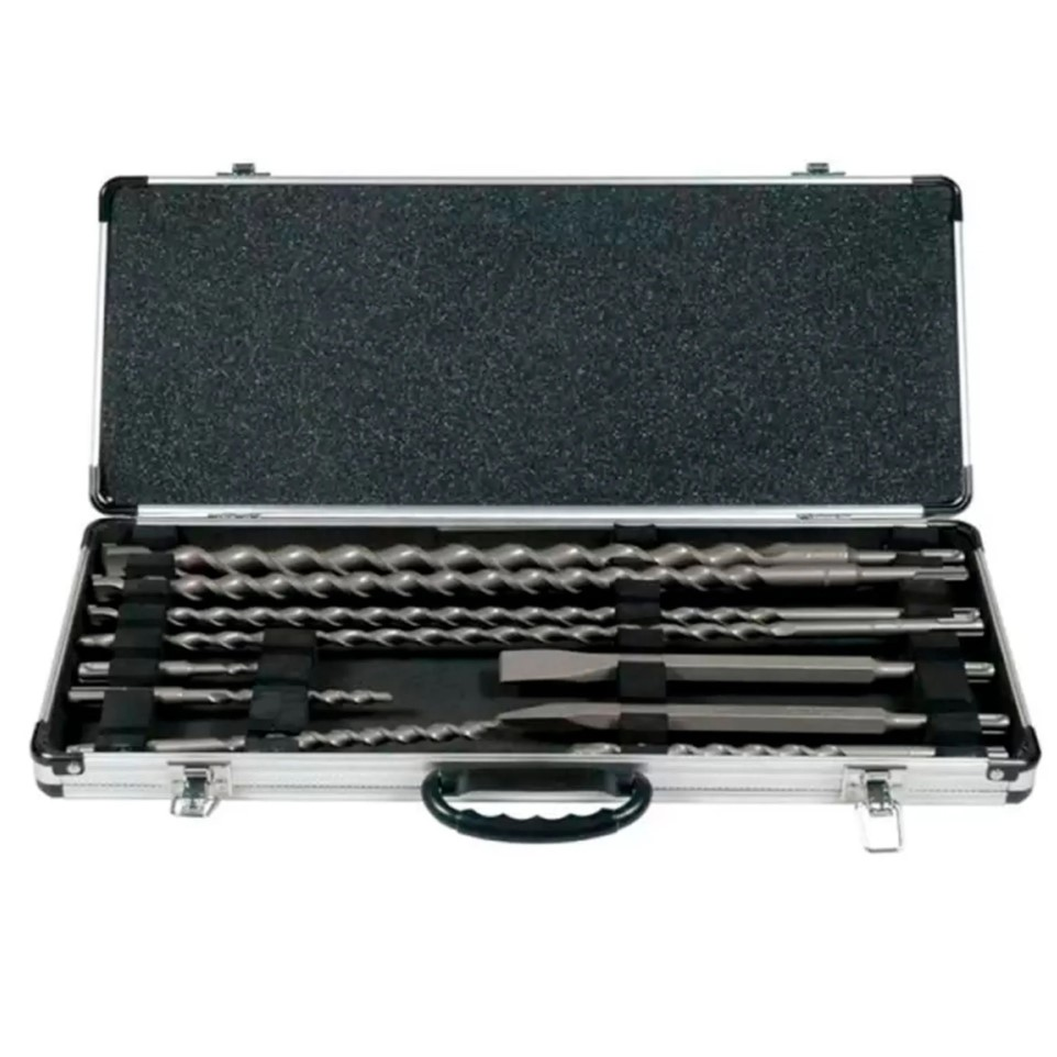 Juego Kit Set de 10 piezas de mechas y cinceles Makita (se compone de 8 mechas y 2 cinceles). Compatible con todas las marcas de Rotomartillos con encastre SDS-Plus. Estuche Maletín de Aluminio