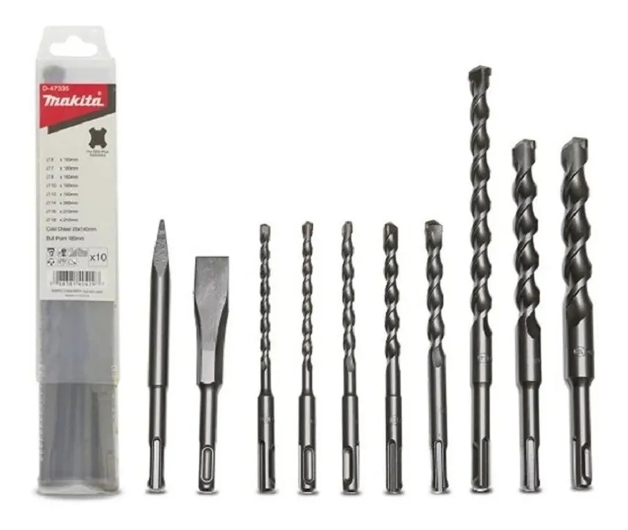 Juego de mechas y cinceles Makita encastre SDS PLUS 10 piezas fabricadas en acero de excelente calidad y robustez, este material brinda la constitución necesaria para la realización de la tarea de perforación y de manera adicional otorga un tiempo de vida formidable en estos accesorios. Las mechas y cinceles Makita SDS PLUS proporcionan una larga vida útil en la perforación y cincelado. Estas mechas y cinceles han sido diseñadas para la perforación y cincelados con percusión en mamposterías hormigón y hormigón armado. Las mismas son compatibles con rotomartillos perforadores con encastre SDS PLUS.