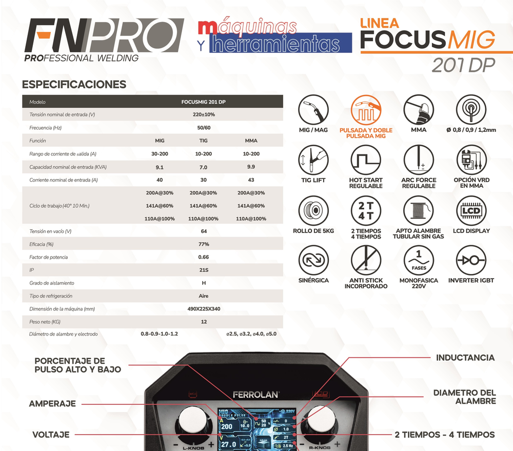 KIT SOLDADORA FOCUSMIG 201 DUAL 1 Y 5KG DUAL PULSE FN PRO