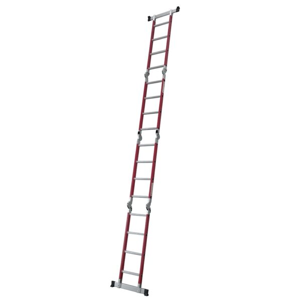 Escalera de aluminio articulada con 4 escalones por lado (4 lados), se adapta y ajusta según la necesidad de altura. Realizada con material aislante eléctrico. Ideal para mantenimiento del hogar o uso profesional.